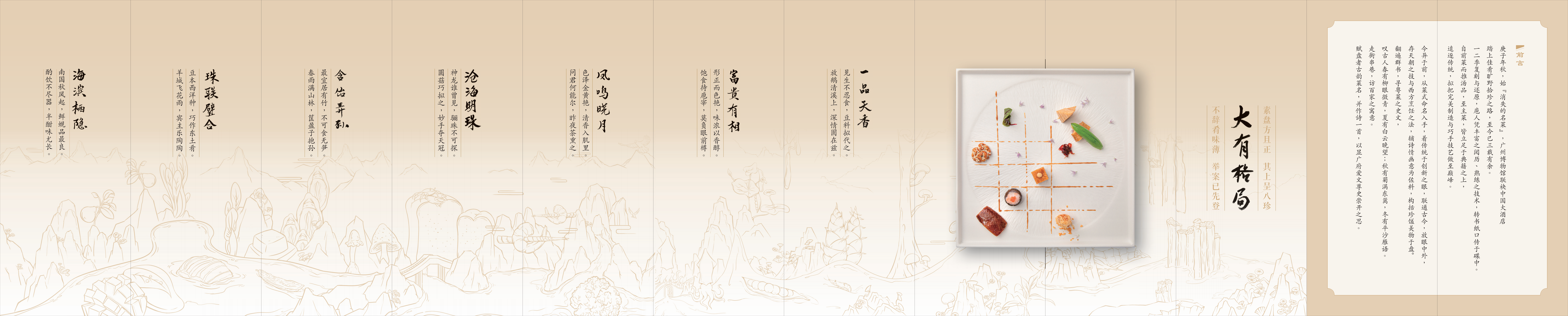 “粤咏诗宴”精心提炼菜式特点,题名赋诗,将诗兴雅怀写入珍馐美馔,既有友朋远来、宾主尽欢的情味,也有君子尚德爱美的情操,并继续秉持粤菜文化中传承守正和融合创新的精神。