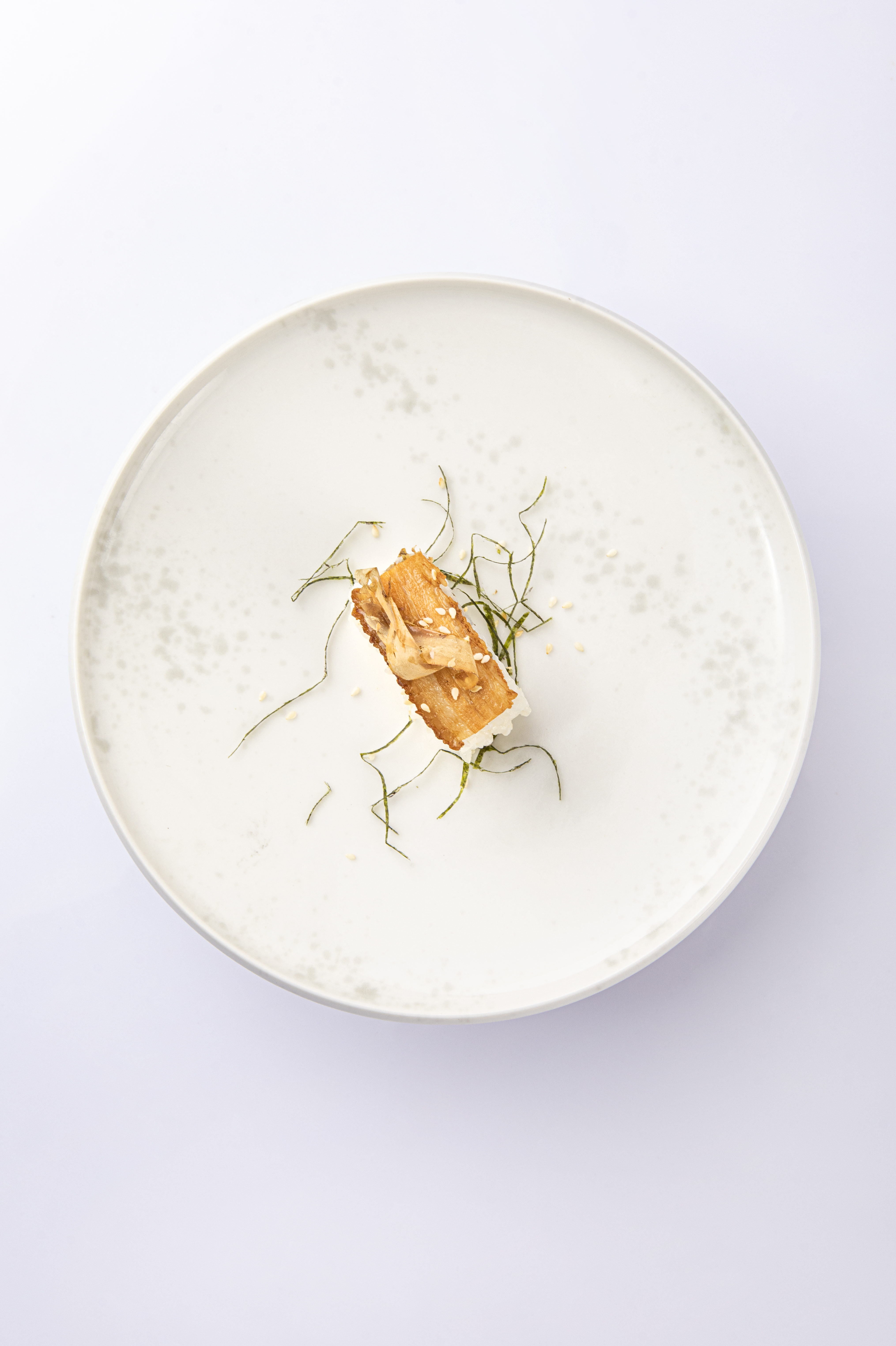 “乳燕新浴”脱胎于传统粤菜当中的“凤吞翅”——以去骨整鸡为外壳,酿入煨好的鱼翅再进行长时间炖煮,这样的制法成本过高,技艺繁复,也不符合当前绿色环保的社会导向,因此改作“鸽吞燕”,以鸽代鸡,以雪耳和火腿替代鱼翅。“眉寿延年”则是中外结合的典型。梅菜扣肉是岭南本土的经典名菜,此次创造性地以寿司为外形,以梅菜为夹心,表面覆以优质味美的五花肉,赋予传统滋味以全新阐释,寿司米饭也用肥仔米和冬麦替代改良,口感丰富而更为健康。