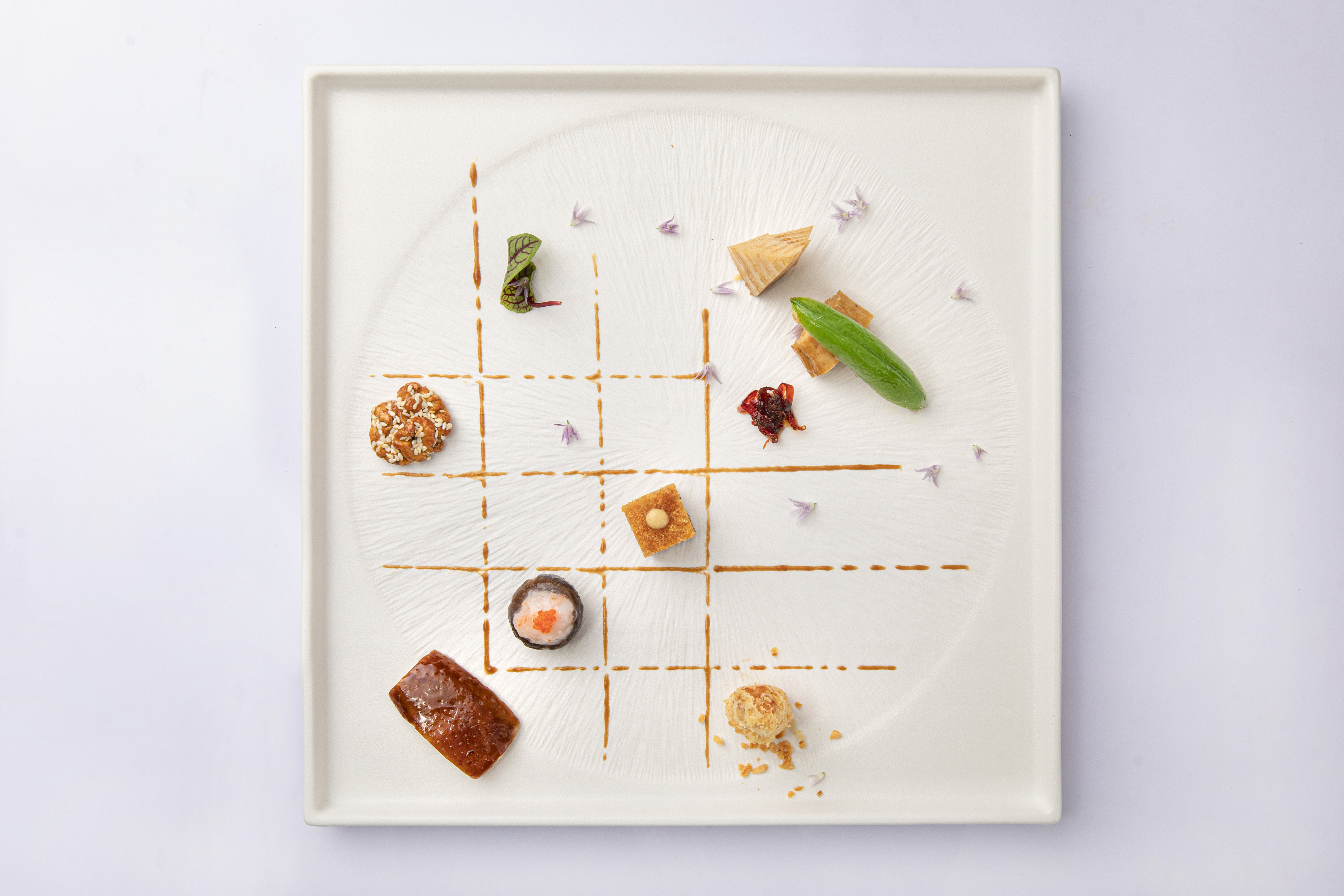 前菜“大有格局”,融通古今,其盘外方内圆,一盘八味,囊括烧、卤、煎、炸、蒸、烤、熏、炒八种基本手法,充分展现传统粤菜烹饪的精华。