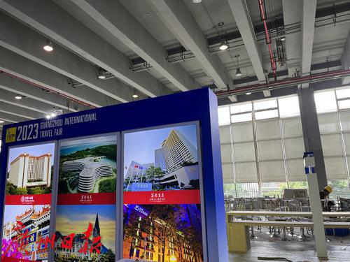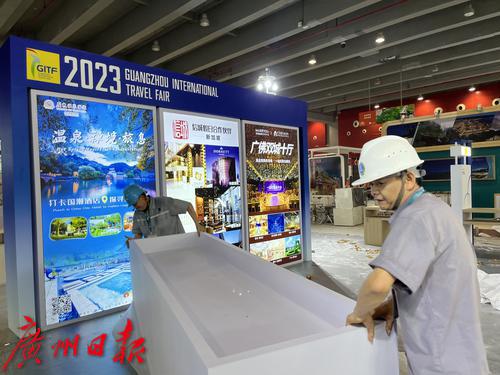 广州国际旅游展览会于2023年5月19-21日在中国进出口商品交易会展馆C区举办。18日中午,工人在展馆里有序布展。