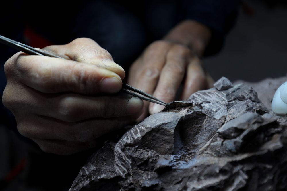 图为工作人员正在研究恐龙蛋化石。(受访者供图)