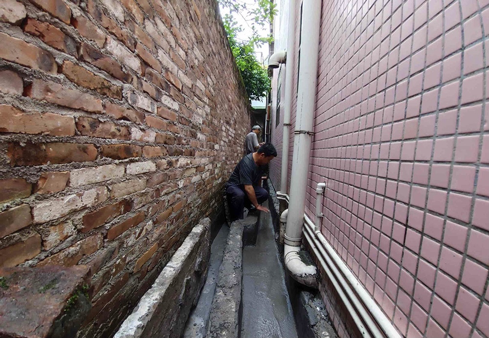 虽然可收取的费用很少,但余师傅为了尽快解决两户家庭的矛盾“症结”,仍然冒雨“开工”,对长约10米的排水渠进行了仔细的清理和疏通。工程的最后,余师傅还对排水渠侧边的雨水分流渠也进行硬底化。在施工过程中,细心的余师傅还发现黎先生该侧的房屋墙根受积水影响受潮脱落,于是主动地为房屋墙根做了防水修复。