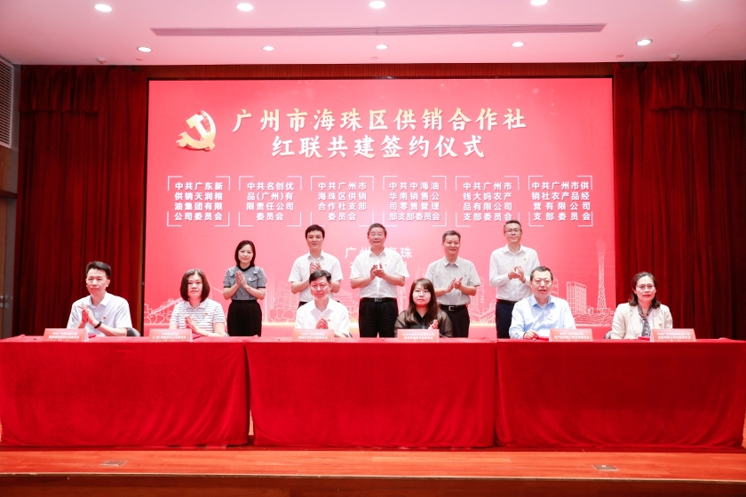 据了解,在活动现场,海珠区供销合作社党支部、中海油华南销售公司零售管理部党支部、名创优品(广州)有限责任公司党委、广州市钱大妈农产品有限公司党支部、广东新供销天润粮油集团有限公司党委和广州市供销社农产品经营有限公司党支部等6个党组织共同签订了红联共建协议书,携手探索党建赋能激活发展动力源的有效途径,走出一条以高质量党建引领“产供销”全链条产业高质量发展的创新实践之路。广州市钱大妈农产品有限公司党支部书记、集团副总经理、公共事务部负责人张伟表示,这是钱大妈党支部成立后第一次以政企合作新模式,开启“共建组织、共抓队伍、共享资源、共谋发展”的党建工作新格局。