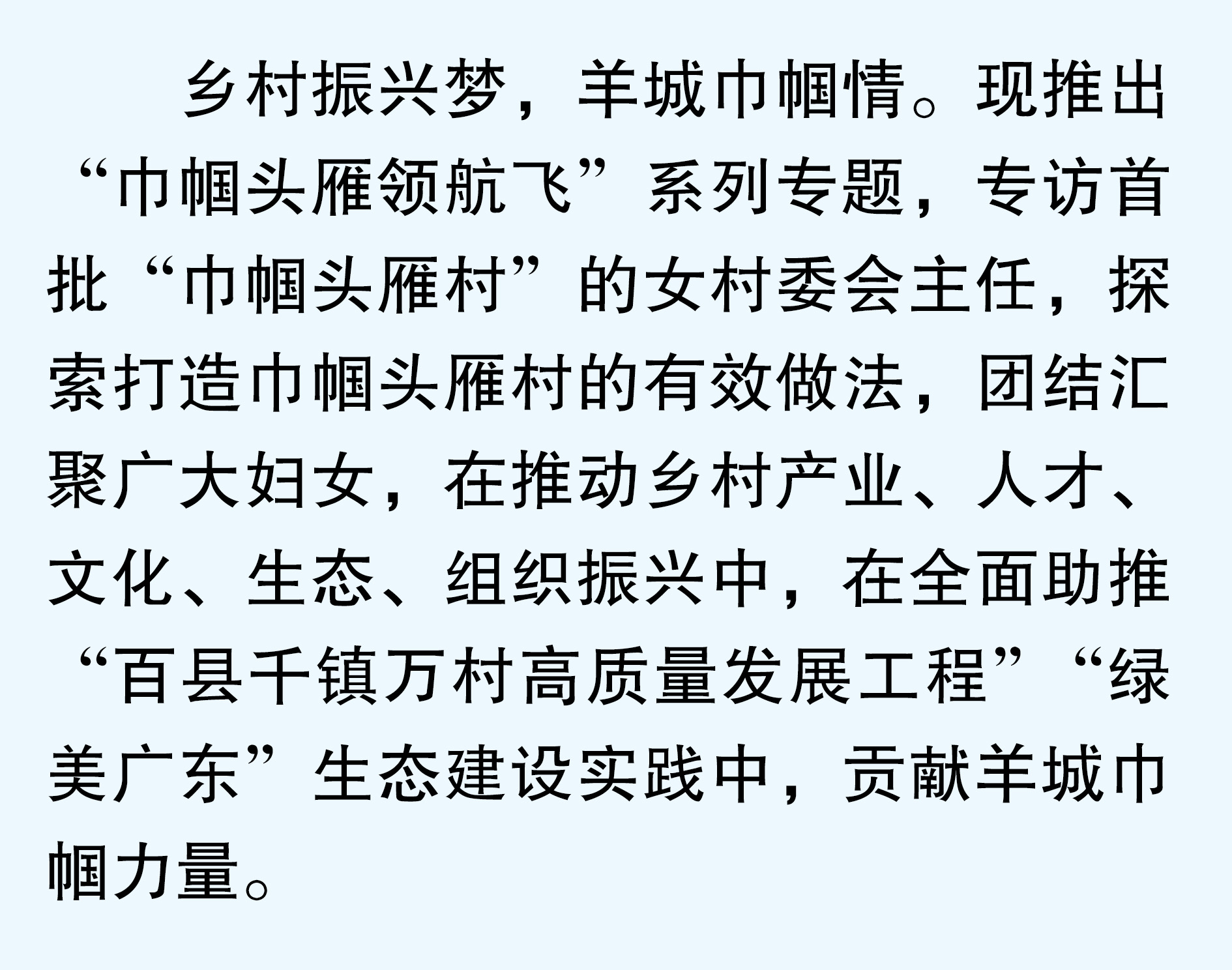 “广州市妇联积极组织开展打造‘广州巾帼头雁村’,我作为‘巾帼头雁村’的‘头雁’,职责是带动‘群雁’一起飞。” 梁可枝说,创建工作不能只靠一小部分人“单打独斗”,而是要动员大家“联动作战”。