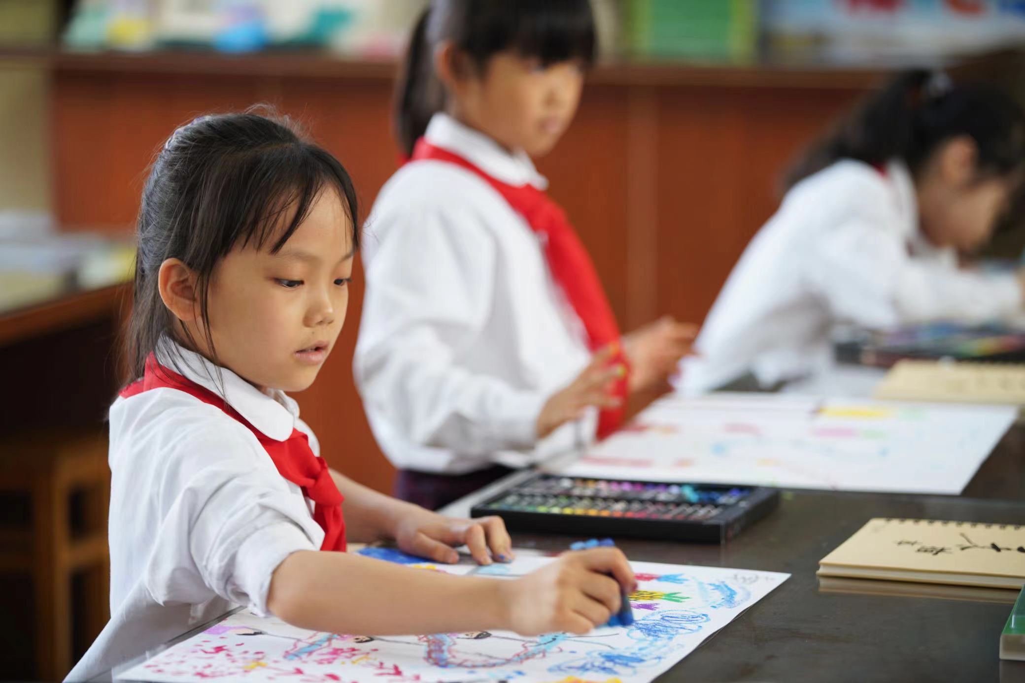 开班仪式后,开讲了第一课。三至四年级学生在孟科老师精心准备的课堂上,寓教于理、寓教于乐,学生们在活跃与兴奋中,完成了开班的第一幅速写和第一幅色粉笔作业,作业充满童趣与想象,感受到了孩子们的热情和创造力。