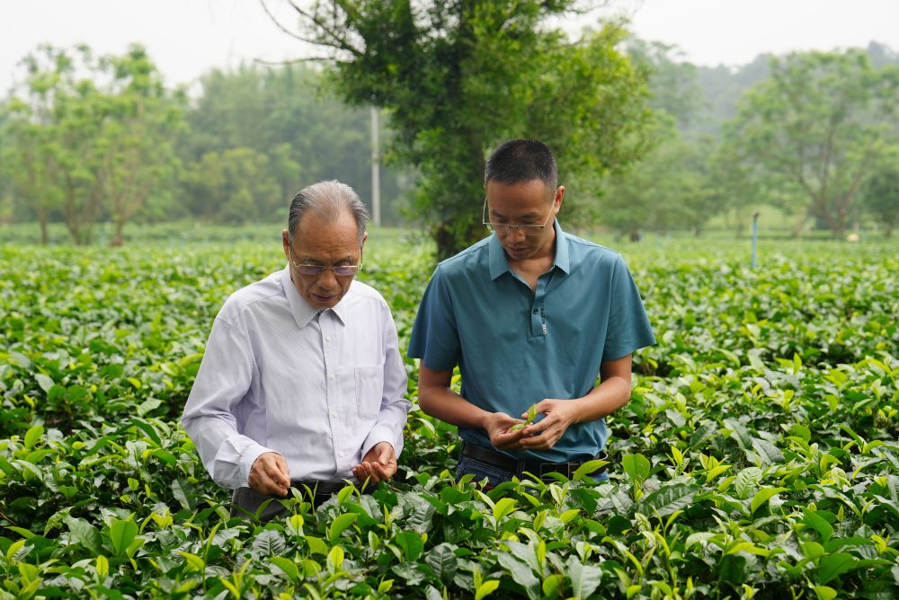 袁学培(左)与徒弟丘少敏就茶叶生长情况进行交流。新华社记者 欧阳建嘉 摄