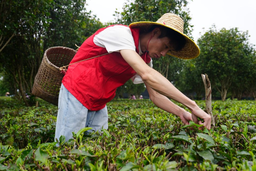 “90后”新农人刁开武正在茶园里采茶。新华社记者 欧阳建嘉 摄