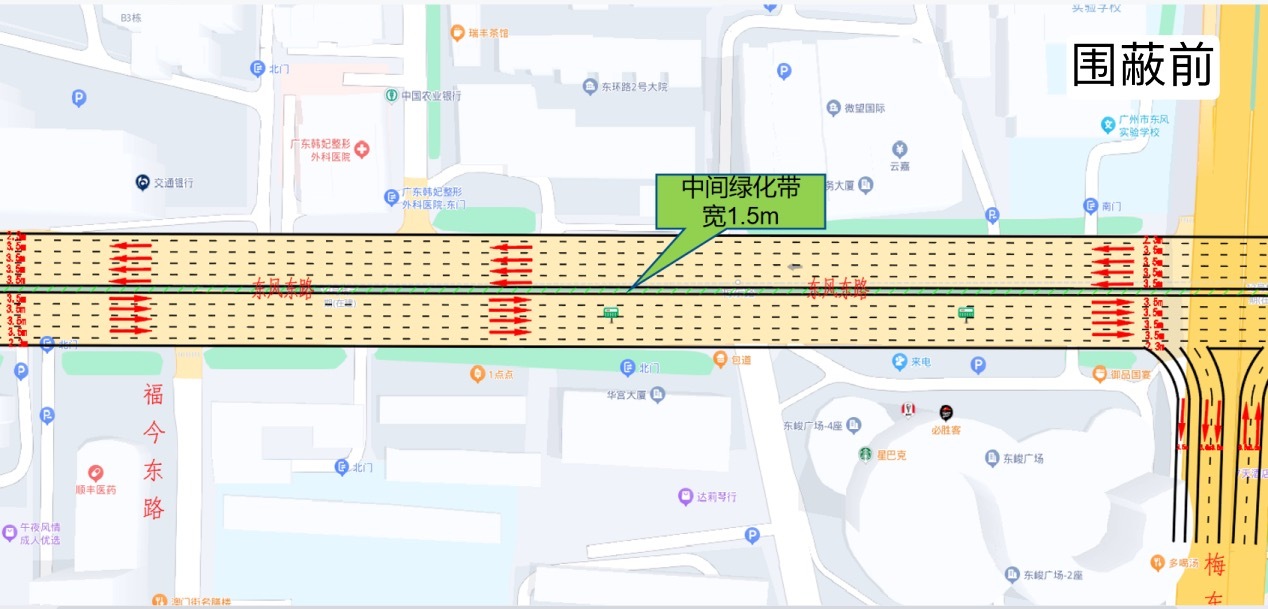 广州地铁今日发布施工围蔽预告,为推进十三号线二期梅东路站建设,施工单位计划于2023年5月27日对东风东路、梅东路部分道路进行围蔽施工,预计30个月。届时,东风东路(福今东路至梅东路段)将占用西往东方向1条车道和人行道,并借用道路中间绿化带作为交通疏解道,道路保持双向8车道通行,道路南侧保留不小于3米宽的人行通道;东风东路东峻广场北侧行人、非机动车道将北移,东侧梅东路北往南方向将占用1条车道,保持双向4车道通行。