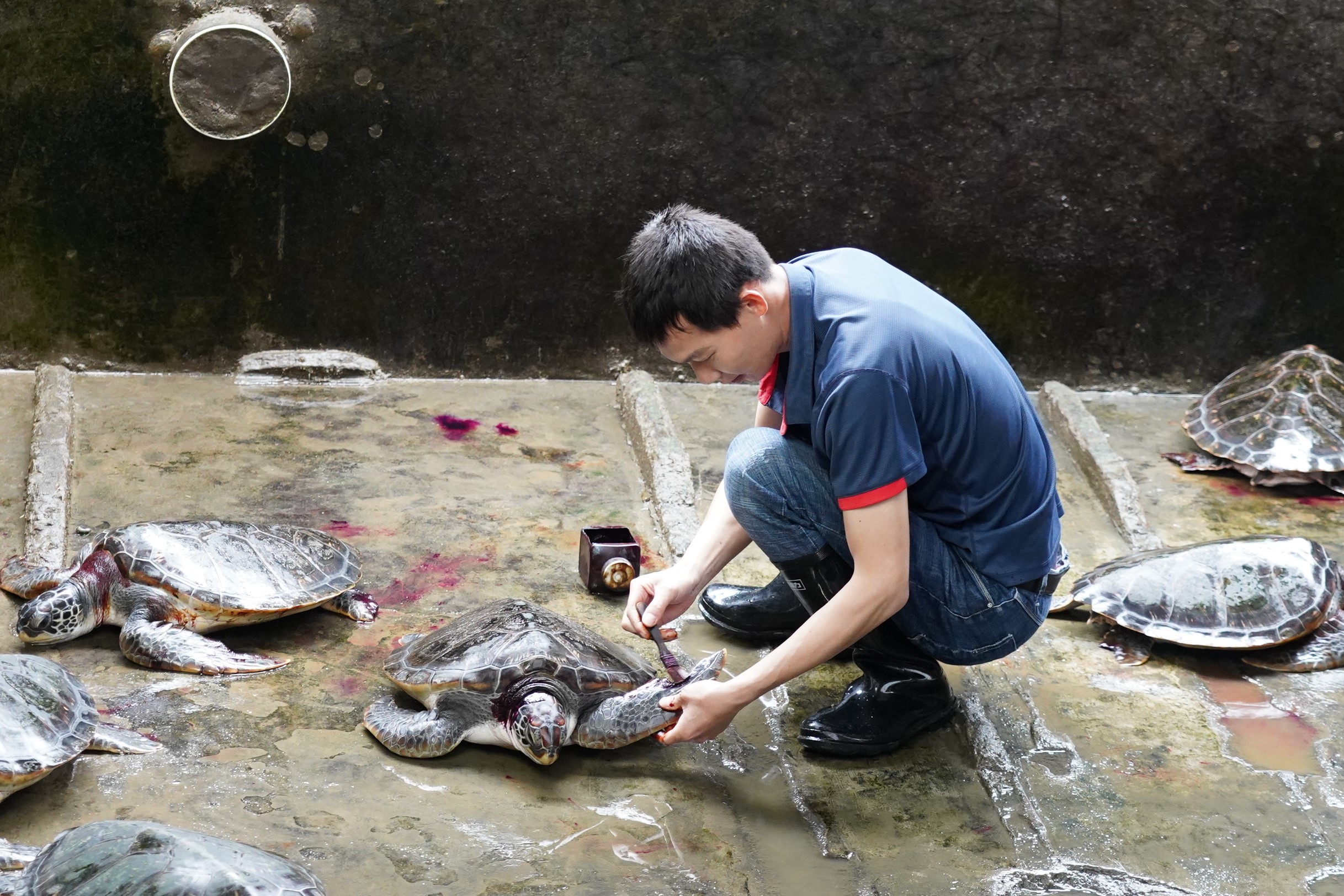 “为了保证海龟的正常生长和繁育,养殖池水必须常年控制在26℃左右。”保护区技术员李满文介绍,在该温度条件下,海龟活跃性变高,食欲会增加,成长的速度变快,雌龟也更容易形成卵泡。但海龟常年圈养,如何控制温度?李满文和同事们在龟池边搭大棚、打钉子、铺塑料膜,同时向上级单位争取购入多套调温装置。