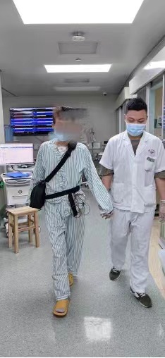 术后数日,在医护团队的陪伴下,患者已经可以背着“小书包”自由活动。