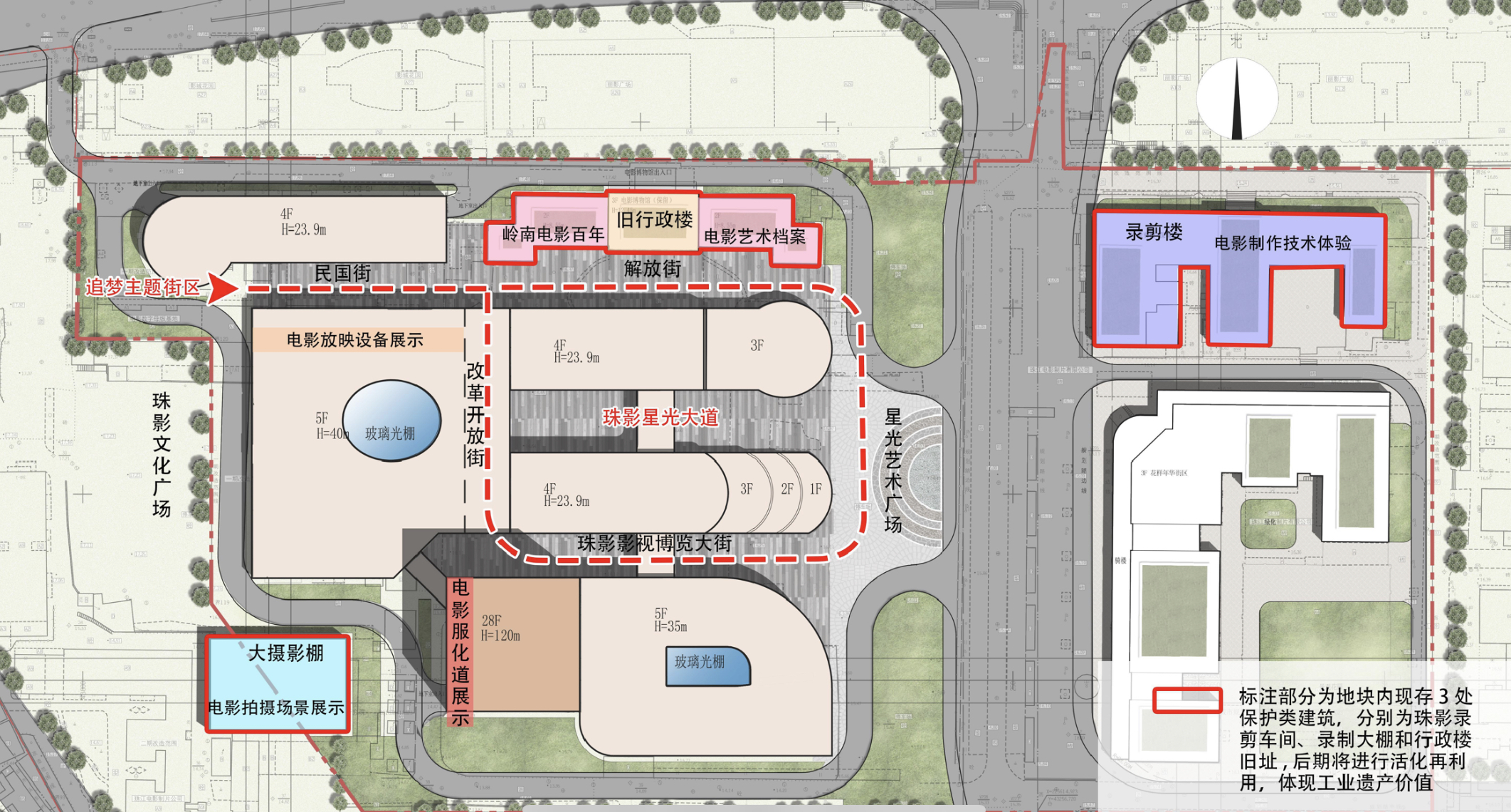 地块内现存的3处保护类建筑——珠影录剪车间、录制大棚、行政楼旧址,后期将活化再利用,体现工业遗产价值。这3处建筑记录了珠影的“威水史”:珠影前身为广州电影制片厂,1956年经国家批准组建,1958年5月正式投产,1961年更名为珠江电影制片厂,1985年变更为珠江电影制片公司实行企业管理,2006年4月转制为珠江电影制片有限公司。经过60多年的发展,形成了影视创作、制作和加工各类影视片、广告片及音像出版等一整套完整的产业链。
