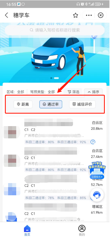 另外,“穗学车”服务还全面展示了各驾校的学车班型、价格、服务项目等内容,驾校信息公开透明,一目了然;同时学员也可根据距离远近、考试通过率、诚信评价等级、场地区域、驾照类型等条件,对驾校进行排序和综合对比,择优选择心仪的驾校和班型报名学车。
