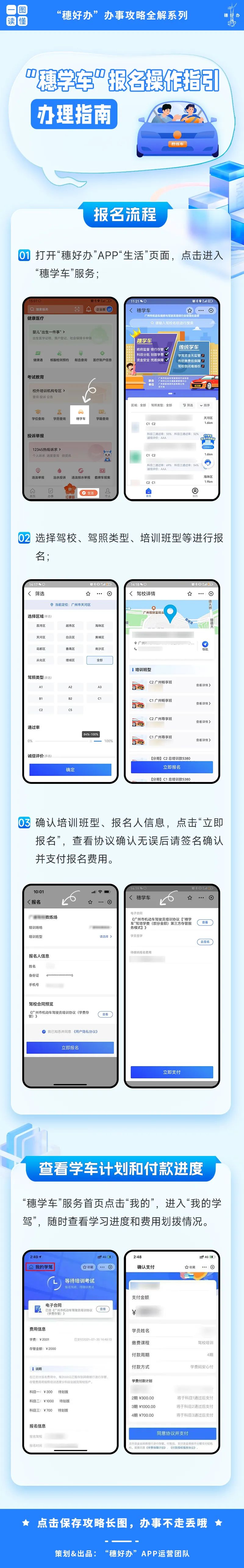 现在,报考学员只需通过“穗好办”APP首页进入“穗学车”服务,即可轻松完成驾校和班型选择、培训协议签订、学费缴纳等报名全流程网办。
