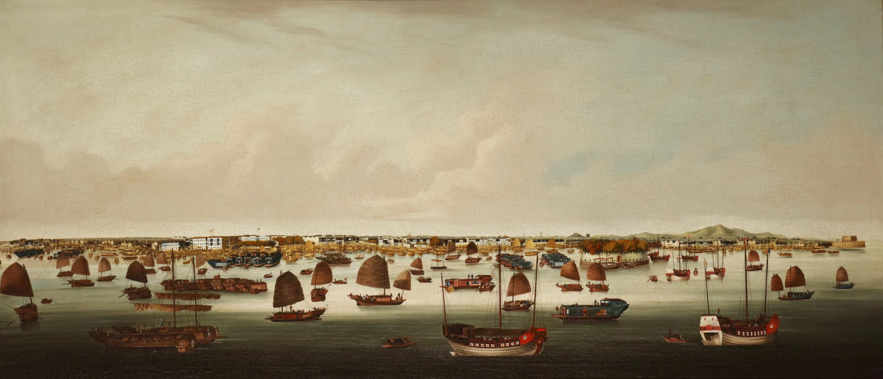在展览中,我们能看到很多早期的广州景色,比如煜呱作于约1845年的《广州港全景图》:宽阔的江面上帆樯云集,从西至东依次描绘了沙面、十三行商馆、海珠炮台直至大沙头附近的东水炮台一带珠江北岸的广阔风景,背景是广州的旧城区,羊城著名的地标光塔(怀圣寺)、花塔(六榕寺)、镇海楼(五层楼)清晰可见。