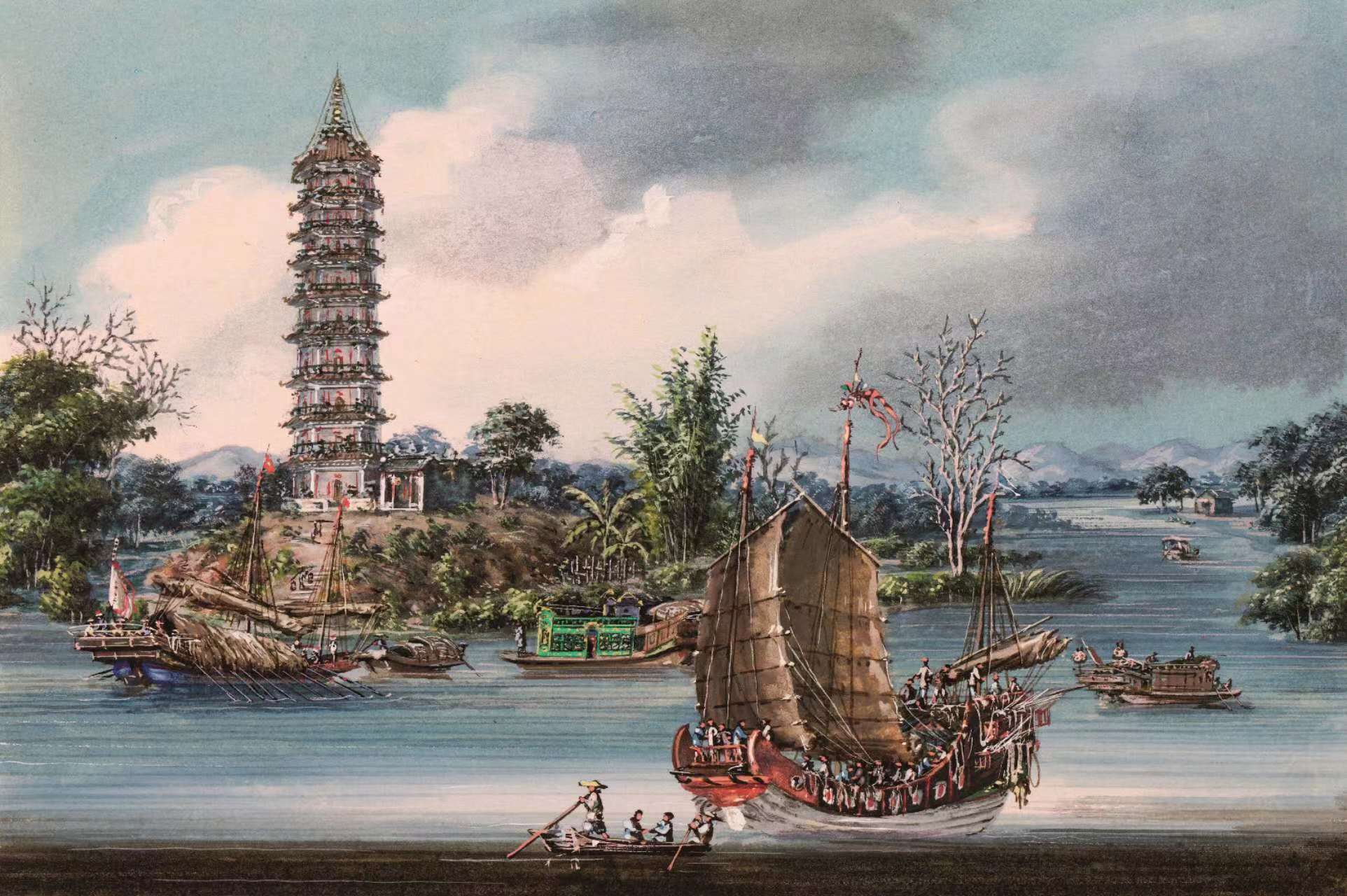 另一些画作中,琶洲塔、莲花山、黄埔锚地等历历在目。而它们所处的环境也与我们今天所熟悉的景象大为不同:琶洲塔直抵水边,黄埔锚地江面宽阔,而镇海楼前的山坡上,少有高大的林木,而是绵延的草地……