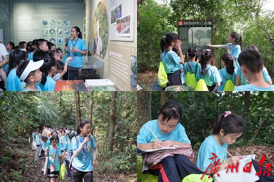 在保护区工作人员的引导下,亲子家庭参观了鼎湖山自然教育中心展览室,了解鼎湖山的基本情况、富集的生物多样性和发生在鼎湖山的生物多样性故事。在鼎湖山自然教育探索径,孩子们跟着老师认真学习探索径上陈列的科普解说牌的知识,了解生活在森林里的“精灵”们,感受森林中悄然发生的变化。此外,孩子们还根据自己感兴趣的主题,创作自然笔记,用笔记录大自然的美好。