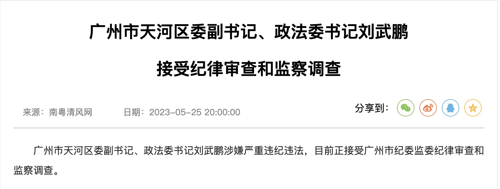 广州市天河区委副书记、政法委书记刘武鹏接受纪律审查和监察调查