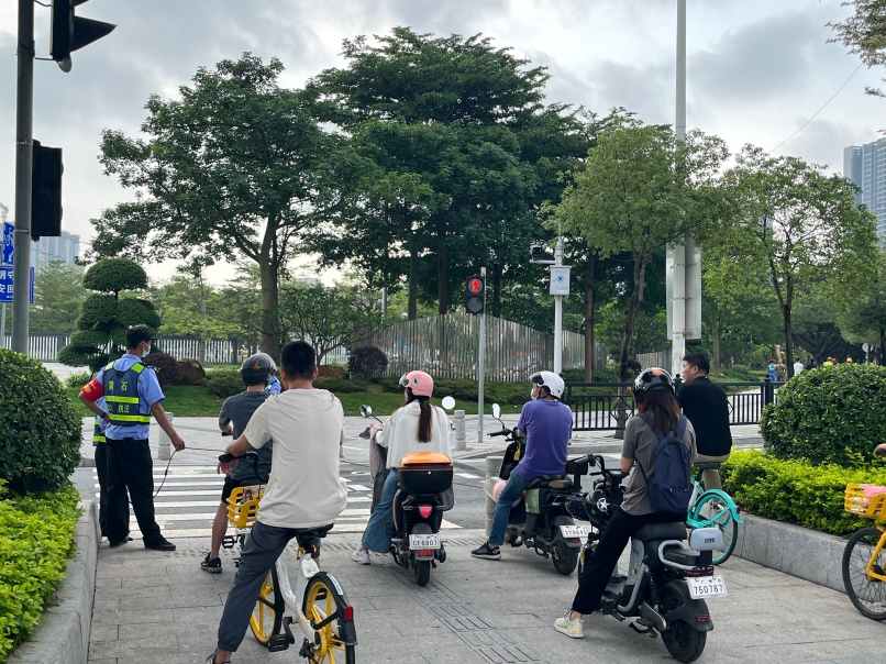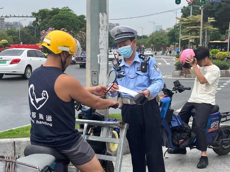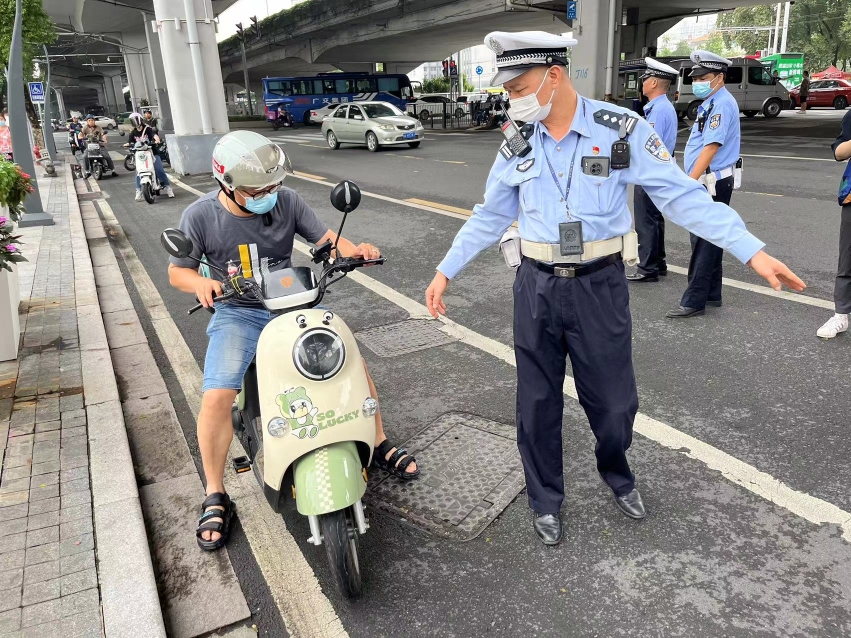 “路口附近为江夏、萧岗、黄边等城中村,电动自行车的保有量大,加上通勤高峰期车流量大,电动自行车的违法行为时有发生。”现场执法的一名交警介绍,由于路口位置的特殊性,四通八达,通勤的电动自行车众多,路面情况复杂。因此,不戴头盔、驶入机动车道、未依法登记上路行驶等行为是该劝导点重点整治的内容。