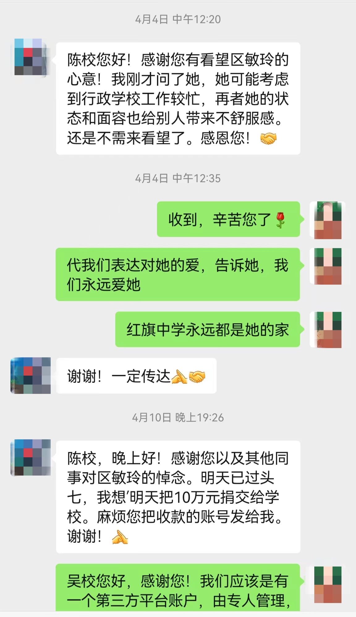 一个普普通通的教师,在自己病危之际,想到的仍不是自己,而是自己心心念念的教育事业,这份大爱令人动容,也催人奋进!4月10日晚,在区敏玲“头七”前一晚,吴老师向陈亚玲发来微信,告知要把10万元善款捐给学校,了却区敏玲的遗愿,这份大爱也将一直在红旗中学传递,激励莘莘学子踔厉奋发。