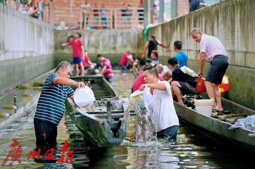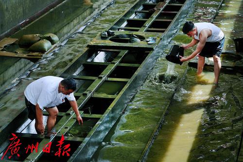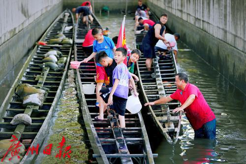 车陂村民从河涌里舀水清洗“东坡号”龙船上的淤泥。