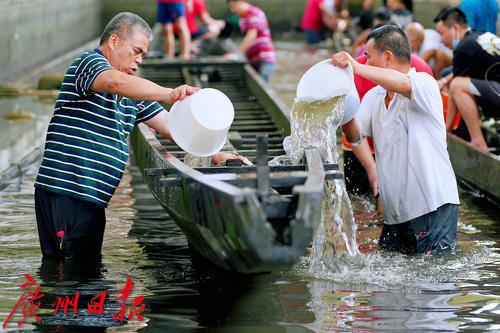 车陂村的男子跳入水中开始起龙船。他们用小水桶等工具,将龙船中的水舀出来。