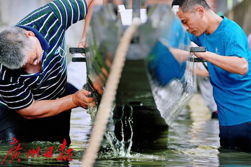 车陂村民们正在进行“起龙”仪式。龙船“起来”后,需要洗净、晒干、修缮等。