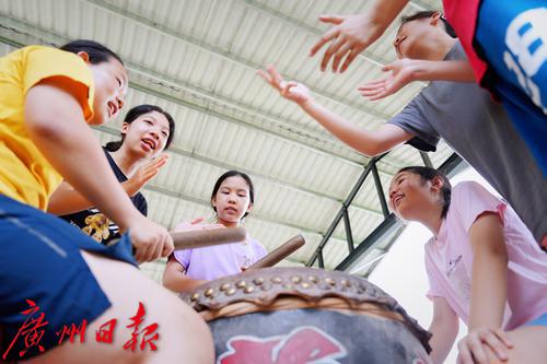 车陂小学龙舟队的小朋友在起龙现场擂鼓助威。