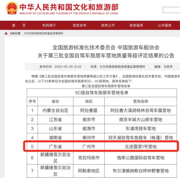 5月25日,全国旅游标准化技术委员会、中国旅游车船协会发布第三批全国自驾车旅居车营地质量等级评定结果公告,其中,花都区北迹露营1号营地榜上有名,是广东省此次唯一获评的营地。北迹露营1号营地成功斩获国家5C级自驾车旅居营地殊荣,代表着国家以及整个行业对北迹露营1号营地的认可。