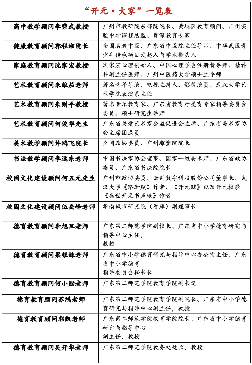 广州开元学校更充分利用社会资源,助力学校教育事业高质量发展。目前,学校有多位各个领域的专家、学者和“大家”鼎力相助。他们助力学校以文化、健康赋能,以艺术“润心”,引领开元学子砥砺奋进、全面发展。这也是学校一直以来的办学主张和重要举措。校方表示,而今“开元请大家”,期待日后“开元出大家”。