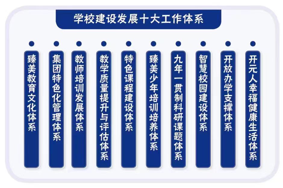 自开办至今,学校还坚持“五化”育人,开创并建设十大办学体系:“臻美”教育文化体系、集团特色化管理体系、教师培训发展体系、教学质量提升与评估体系、活动课程建设体系、“臻美少年”培训培养体系、九年一贯制科研课题体系、智慧校园建设体系、生态资源开发支撑体系和开元人幸福健康生活体系。