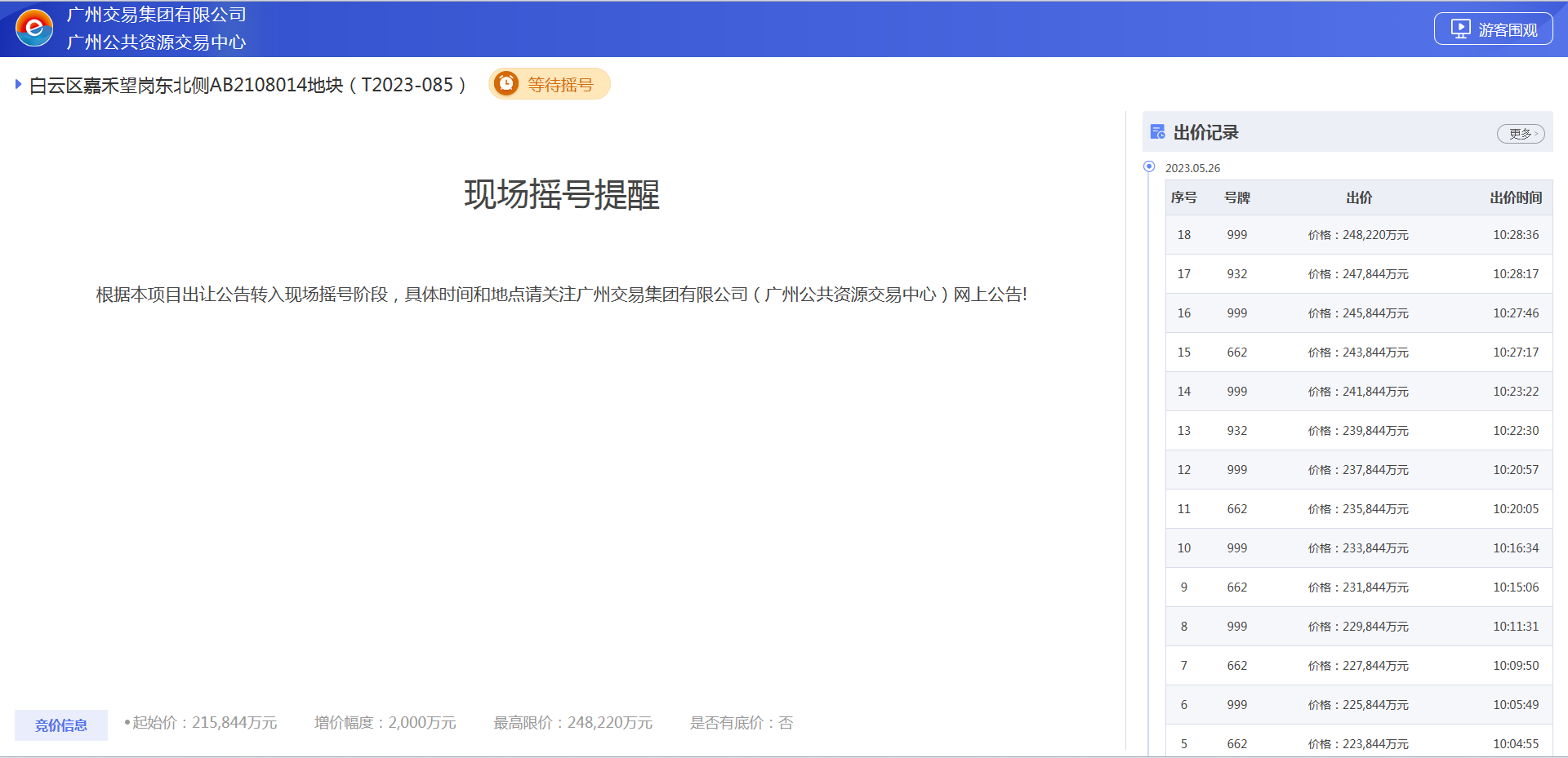 5月26日,经过18轮激烈竞价,广州市白云区嘉禾望岗东北侧AB2108014地块达最高限价,进入封顶摇号环节。地块竞拍封顶总价248220万元,可售部分楼面地价为27600元/平方米,未来将建设10万平方米的高品质住宅区。这也是今年以来,白云区出让的第一宗居住用地。