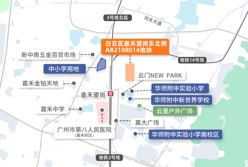 AB2108014地块从挂牌出让开始就广受关注,因其区位优势极其明显。一方面,地块位于设计之都北延区,泛白云新城范围,定位为商务核心区,未来将打造为产城融合的TOD综合开发示范区;另一方面,地块西邻空港大道,北靠松园路,距离地铁2号线、3号线、14号线汇聚的嘉禾望岗站仅500米,交通十分便捷。