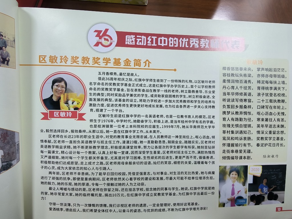 斯人已逝,精神长存。区敏玲永远地离开了,但她临终前留下的意愿,在家人和学校的共同努力下得以完成——5月20日,在红旗中学36年校庆庆典活动中,区敏玲奖教奖学基金正式成立。