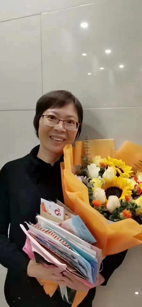 患癌期间,区敏玲收到同事和学生的加油卡片和鲜花(红旗中学 供图)