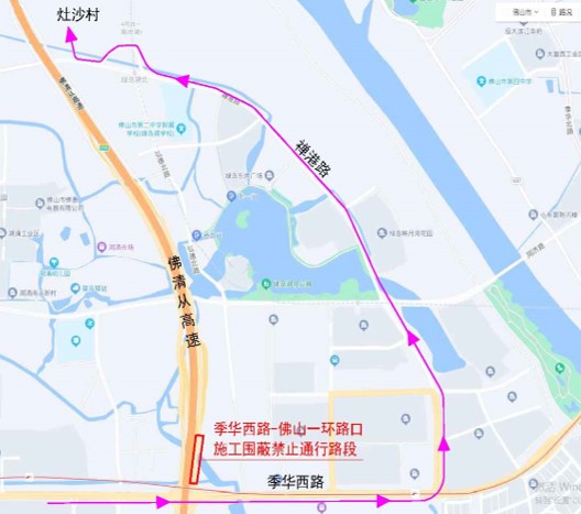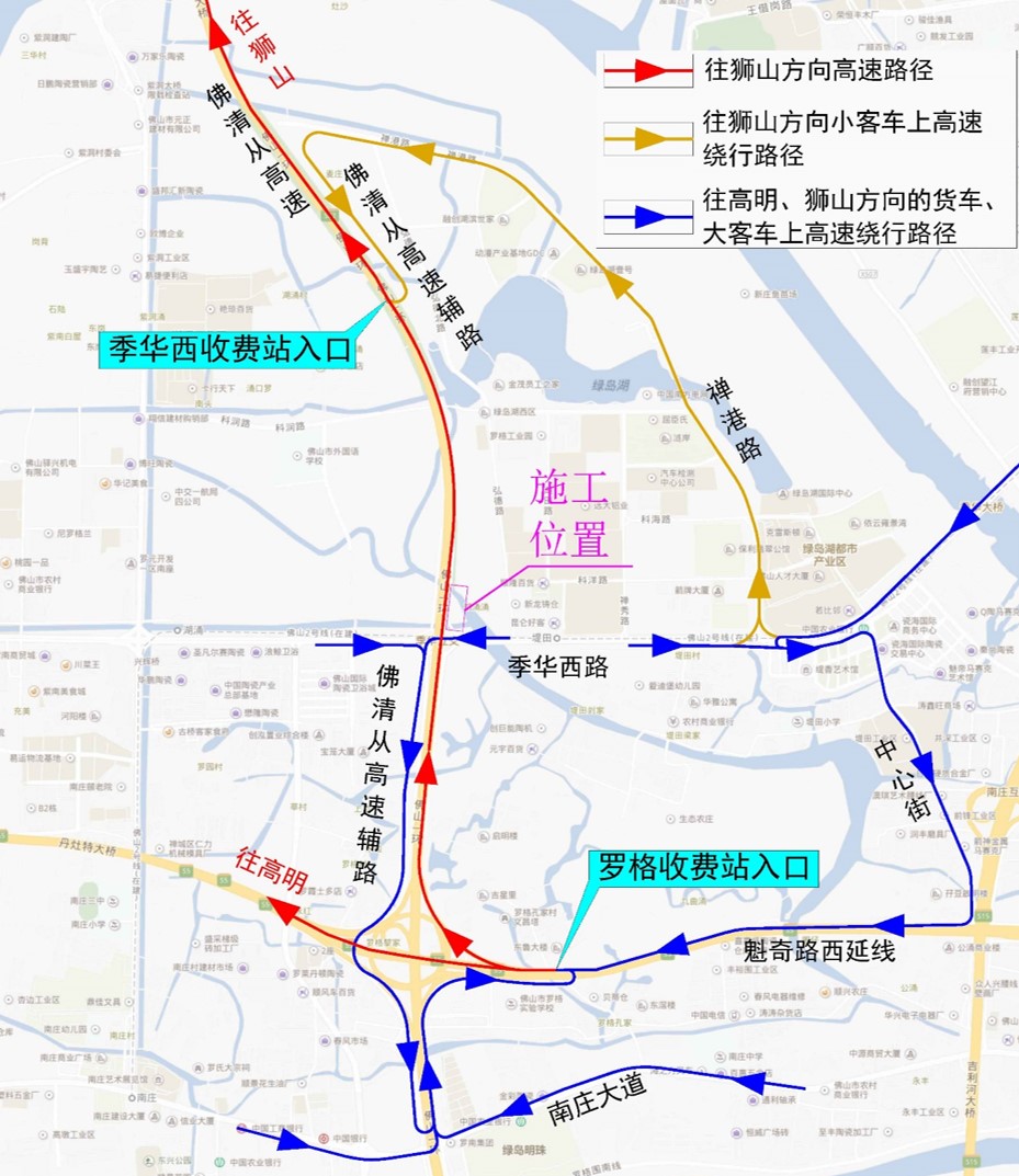 其中,进入灶沙村的车辆可由季华西路绕行禅港路进入灶沙村。往狮山方向小客车,可绕行禅港路进入佛清从高速辅道由季华西收费站入口进入佛清从高速往北行驶(本路径仅小客车可上高速,措施将在2023年5月29日零时实施)。往狮山方向的货车、大客车,可绕行魁奇路西延线由罗格收费站入口进入佛清从高速往北行驶。往高明方向的车辆,可绕行魁奇路西延线由罗格收费站入口进入广明高速往西行驶。