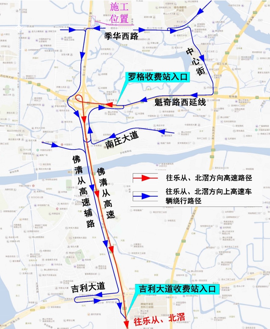 往乐从、北滘方向上高速的车辆,可绕行魁奇路西延线由罗格收费站入口进入佛清从高速往南行驶;或绕行佛清从高速辅道至吉利大道收费站入口进入佛清从高速往南行驶。佛山大道、禅西大道沿线片区的车辆往狮山方向可绕行桂丹路,往乐从、北滘方向可绕行吉利大道、乐从大道。围蔽期间,公交线路不受影响。