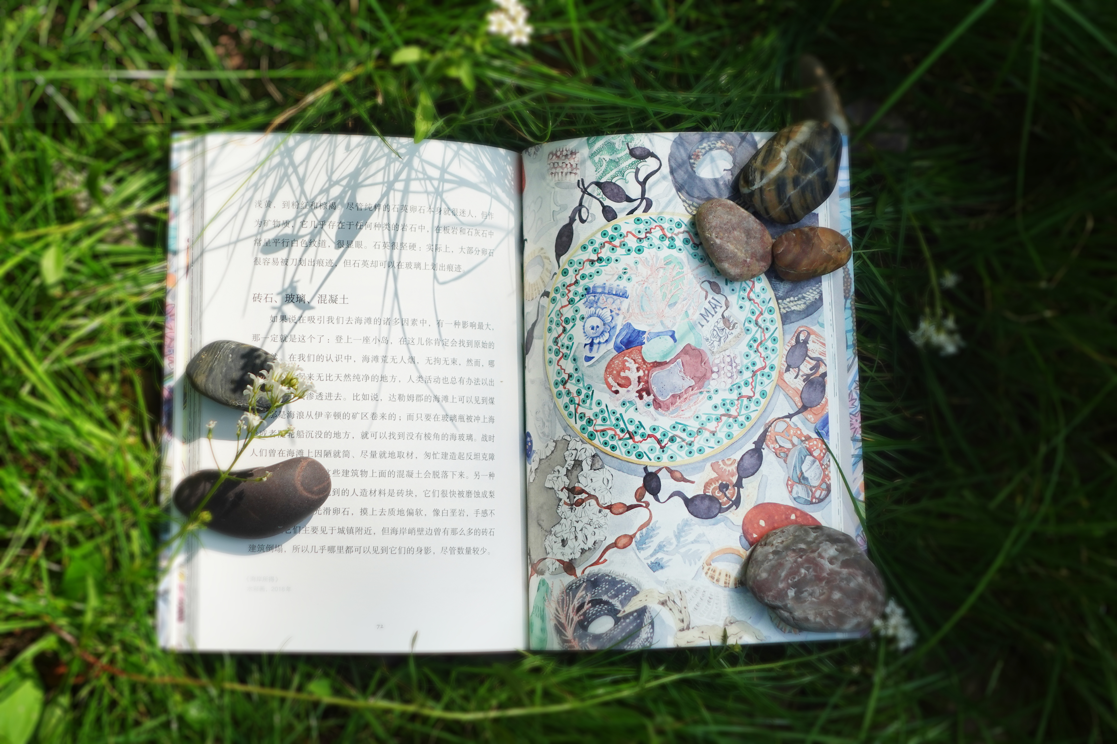 我则将捡回来的卵石随意撒在窗台和工作室的架子上,和我那批豁了口的杯碗放在一起,而它们也一样美丽,一样珍贵。我不是地质学家,但它们的模样以及在手中的触感令我着迷,让我想要描绘它们。我以前是通过描绘本地花卉,慢慢增长了对它们的了解,现在我也以同样的方式慢慢增长了对卵石的了解。引发我兴趣的,是它们与周遭植物的关系,还有它们同远处的岩石、大海与天空一同构成的景色。在我眼中,卵石同最最渺小、最不起眼的植物一起,定义了整个风景。也正是通过它们,我尝试描绘出自己所喜爱的那些荒野之地。