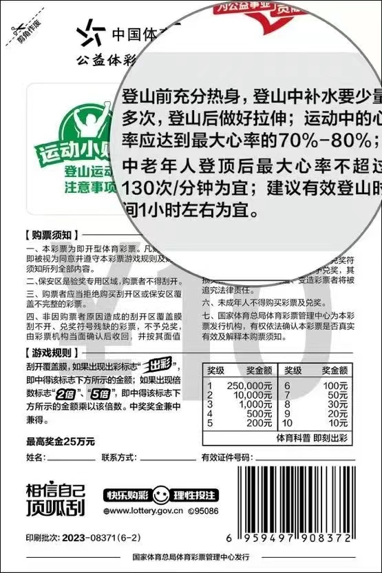 在这个元气满满的五月,体彩顶呱刮新推出“体育科普 即刻出彩”即开票,不仅可以享受刮票的乐趣,还可以学习健身知识,票背面印有“运动小贴士”,了解登山、慢跑、骑行运动的优点以及在运动过程中的注意事项,教你科学健身。