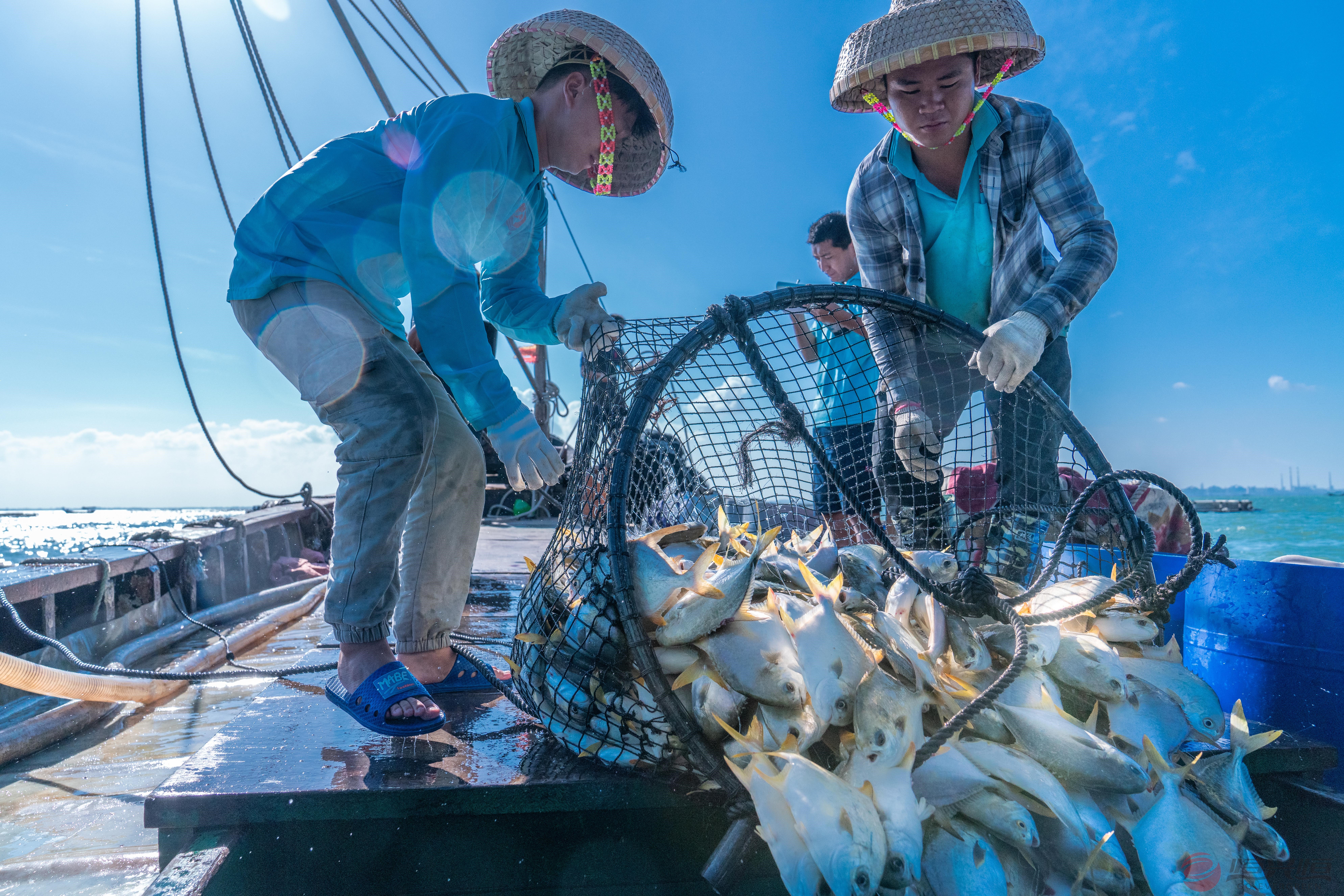 在广东恒兴集团位于湛江东海岛的海洋牧场中,渔民在收获金鲳鱼。