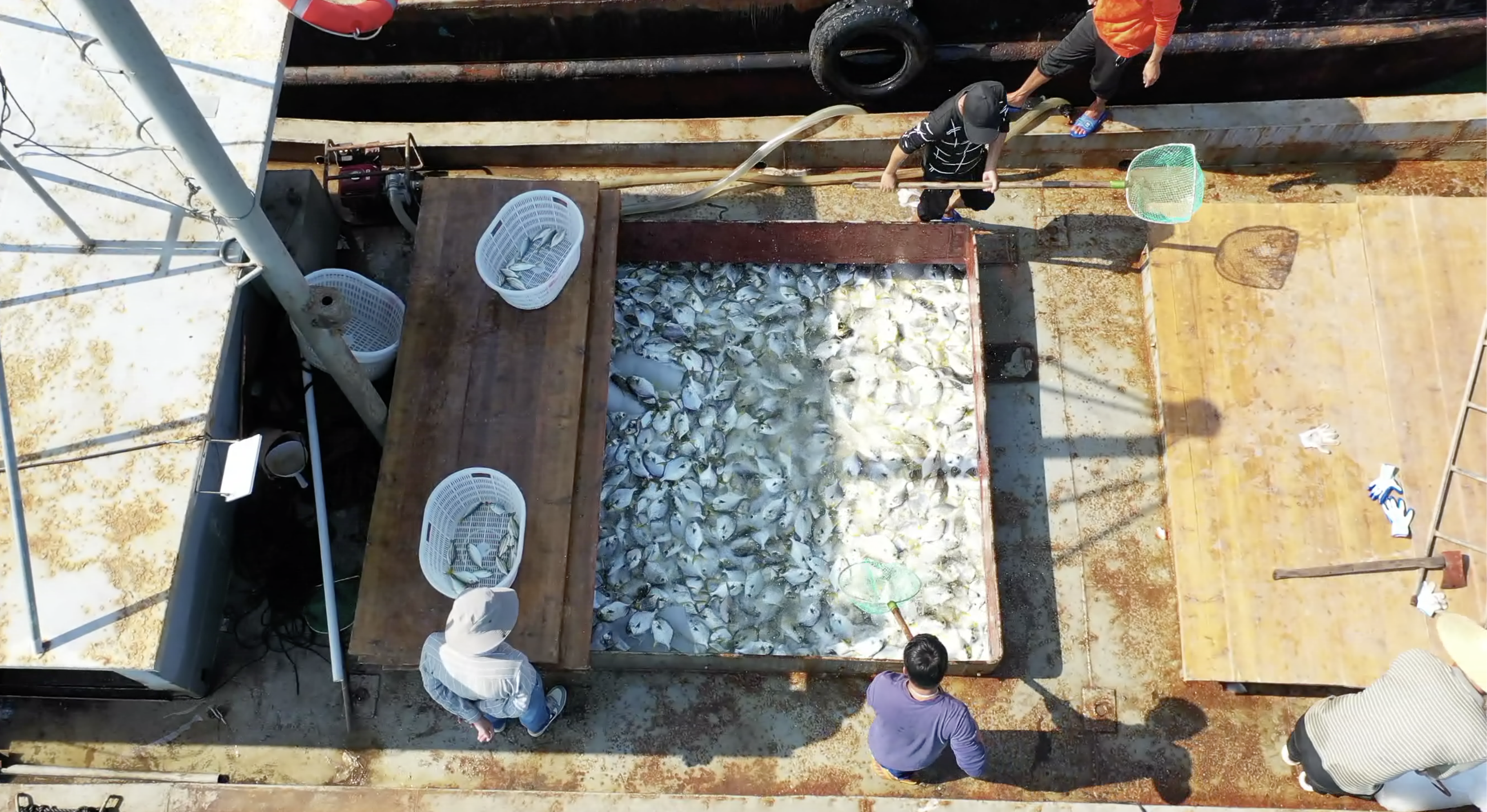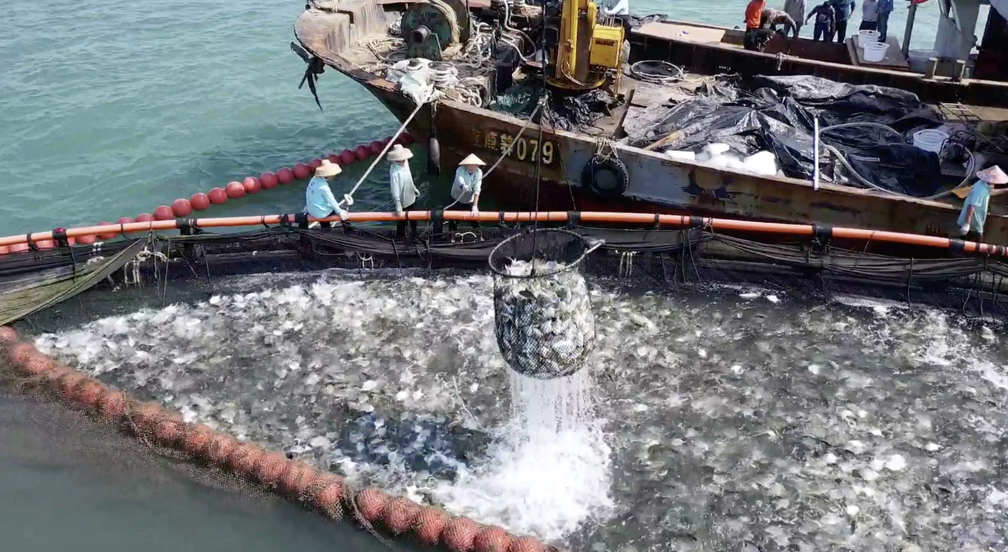 在广东恒兴集团的海洋牧场,工人们在收获金鲳鱼。