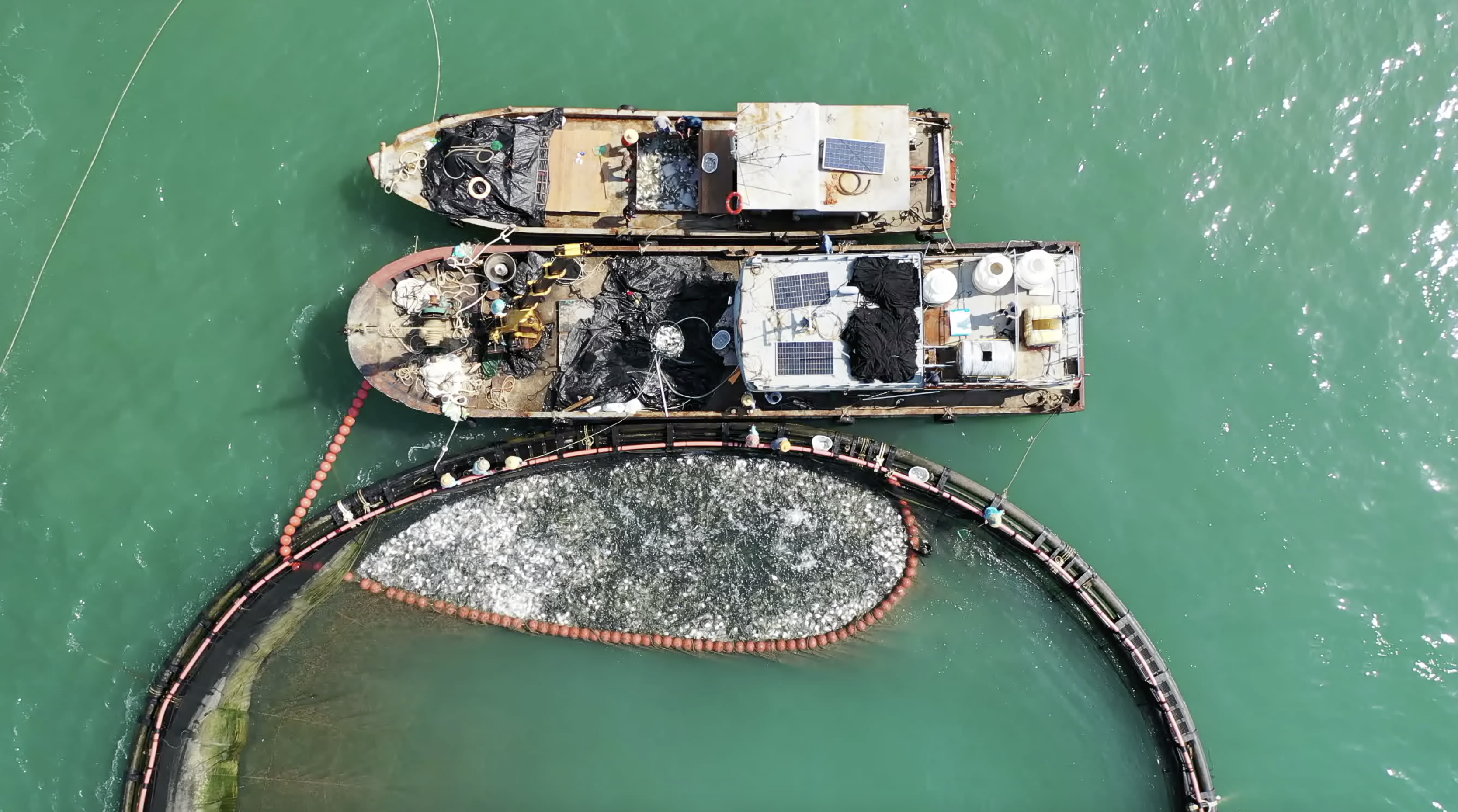 在恒兴集团的一处深水养殖网箱,渔民在收鱼。
