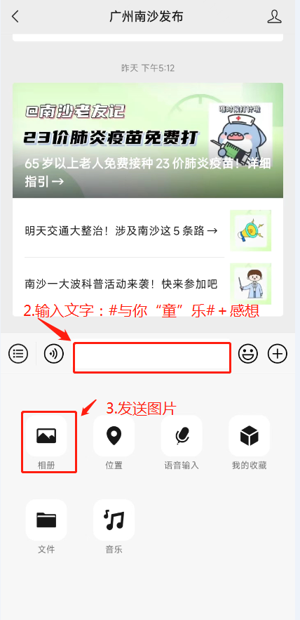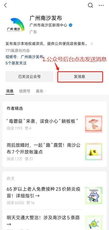 关注“广州南沙发布”微信公众号,点击公众号后台对话框,私信发送图片和文字即可。
