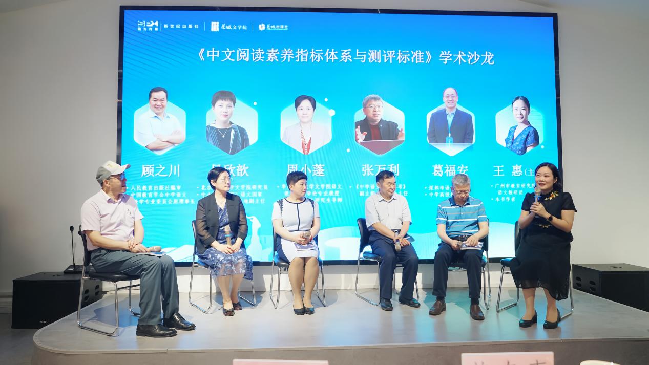 发布会现场举办了学术沙龙。沙龙由王惠老师主持,特别邀请人民教育出版社编审、中国教育学会中学语文教学专业委员会原理事长顾之川教授,北京师范大学文学院教研员、中小学(中职)语文国家教材重点研究基地副主任吴欣歆教授,华南师范大学文学院语文课程与教学论专业教授、语文教育硕士研究生导师周小蓬教授,《中学语文教学参考》副主编、编委会主任张万利老师,及深圳市语文教研员葛福安老师围绕“中文阅读素养指标体系与测评标准”这一议题,进行学术交流与研讨。