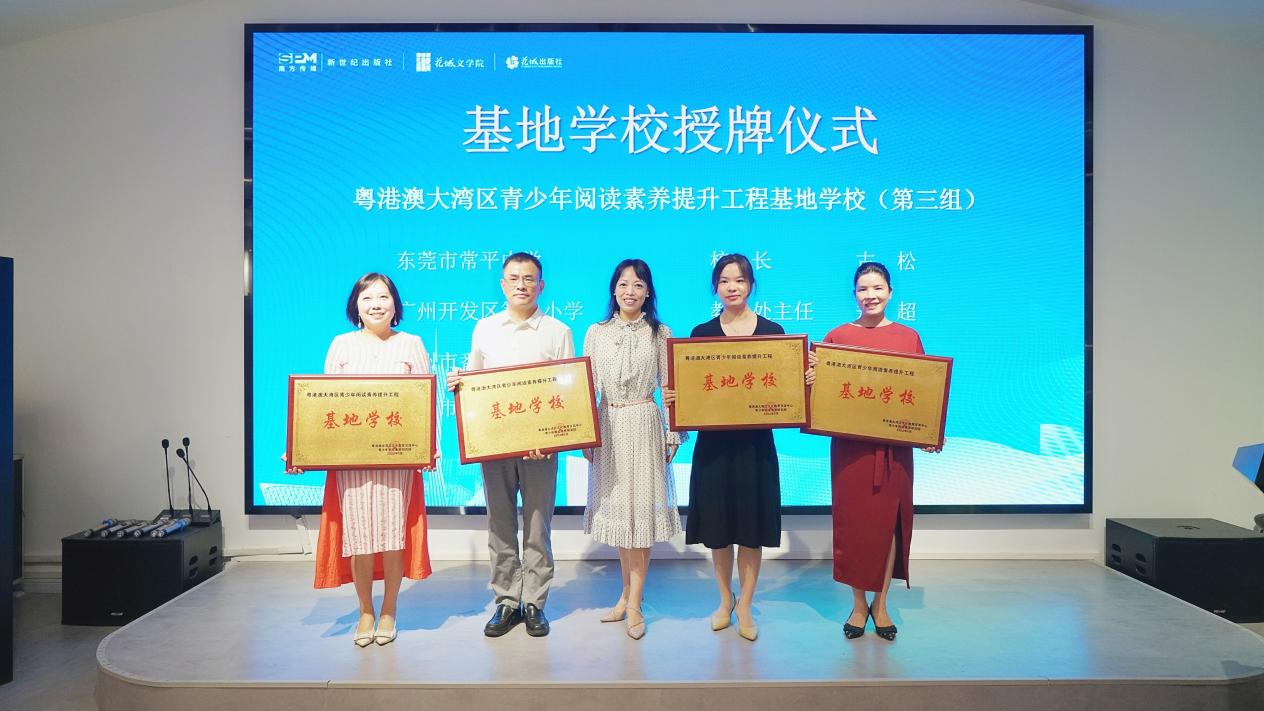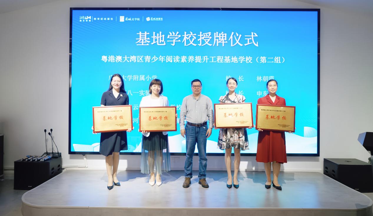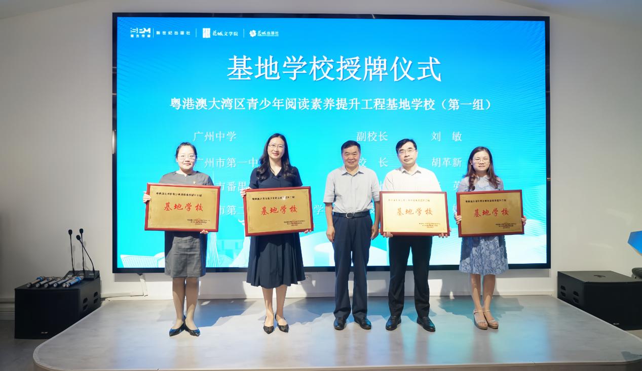此外,发布会上还举行了基地学校授牌仪式,为到场的12所基地学校颁发“粤港澳大湾区青少年阅读素养提升工程基地学校”牌匾。广州市第一中学胡革新校长作为基地学校代表进行发言。