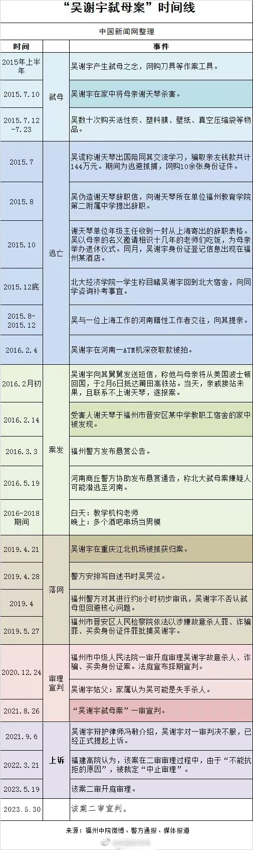 2023年5月30日,福建省高级人民法院对吴谢宇故意杀人、诈骗、买卖身份证件上诉一案二审公开宣判,裁定驳回上诉,维持原判。