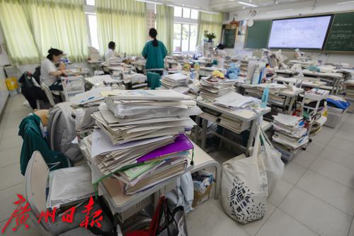 高三同学的教室内课桌上堆满了书本。