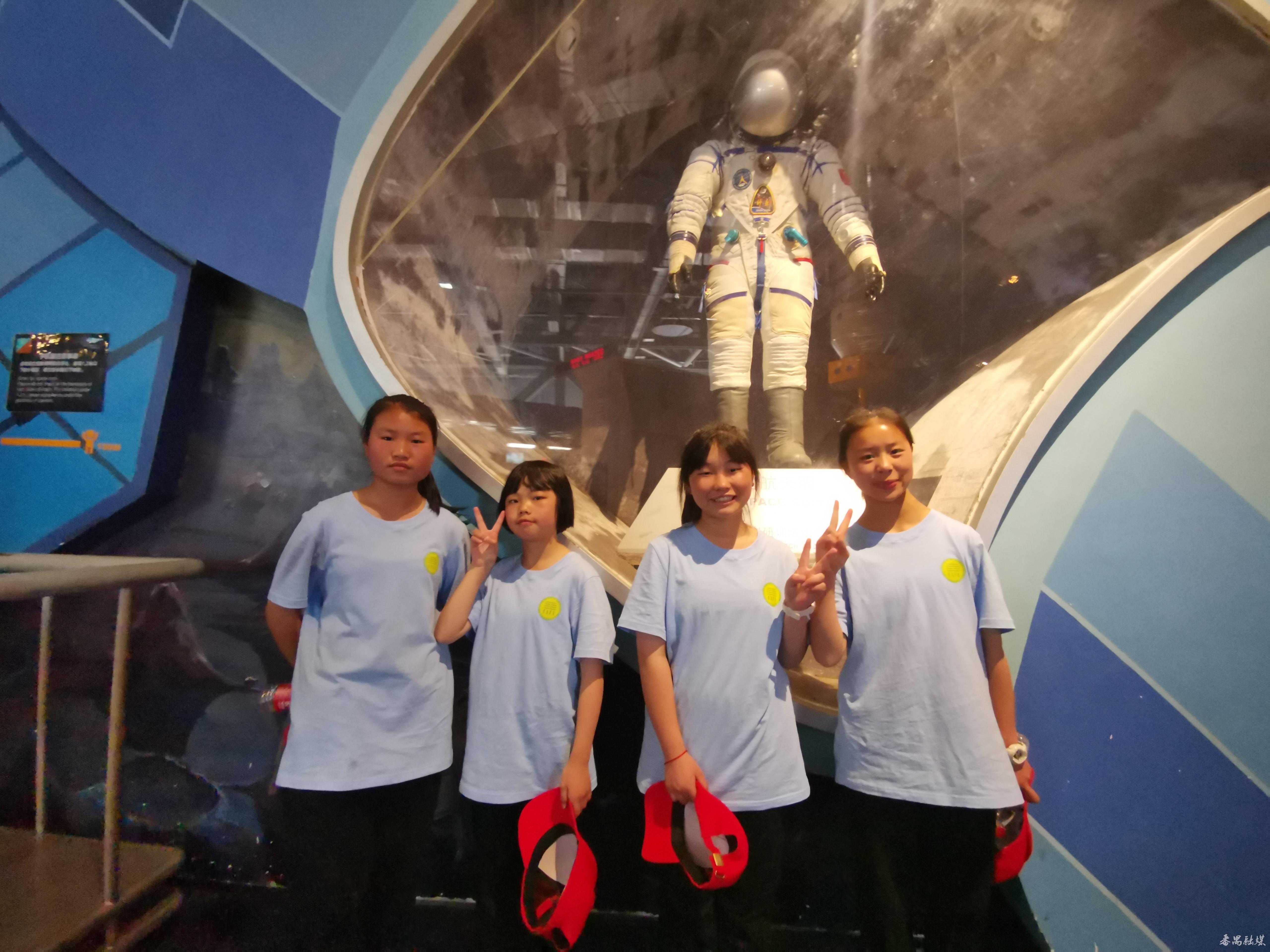 孩子们和宇航员的航天服合影