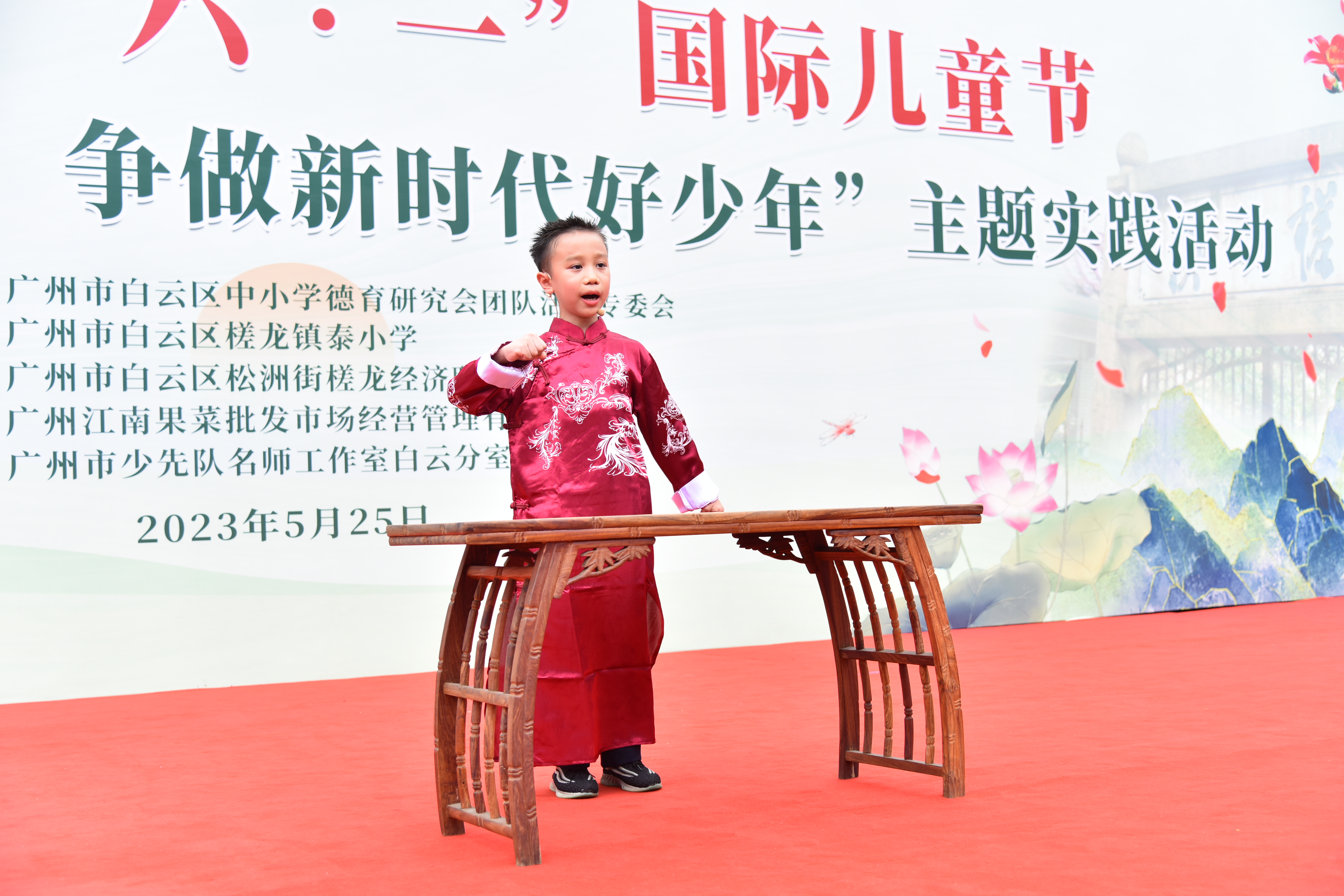 “六一”儿童节到来之际,广州市白云区槎龙镇泰小学举行庆祝“六一”国际儿童节暨“弘扬优秀文化风尚 争做新时代好少年”主题实践活动,共有38名一年级新同学光荣地宣誓入队。主题活动展示了讲古、武术等尚善槎溪特色校本课程的教学成果,同学们在一场丰富多彩的“潮墟”活动中欢度儿童节。