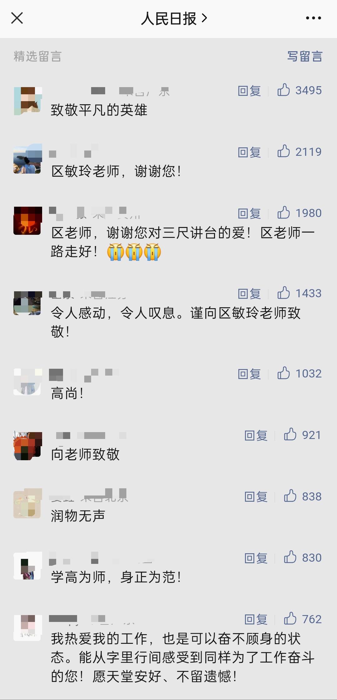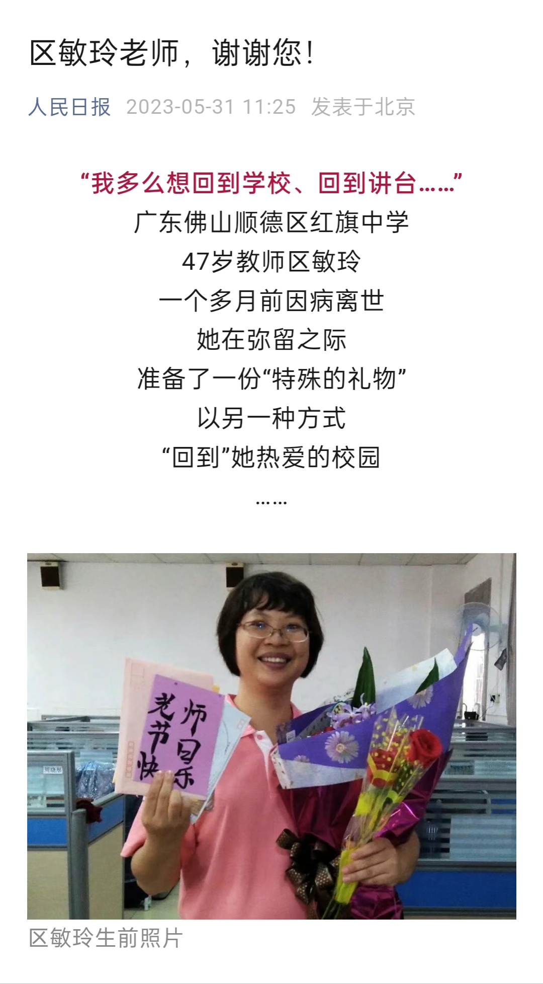 5月31日11时许,人民日报官方微信公众号发布推送《区敏玲老师,谢谢您!》,聚焦广东省佛山市顺德区红旗中学抗癌教师区敏玲的感人事迹,阅读量迅速突破10万+,引发全网热议。不少网友被这位广东教师的敬业、奉献、淳朴、善良的品质所打动,纷纷留言表达谢意、敬意。