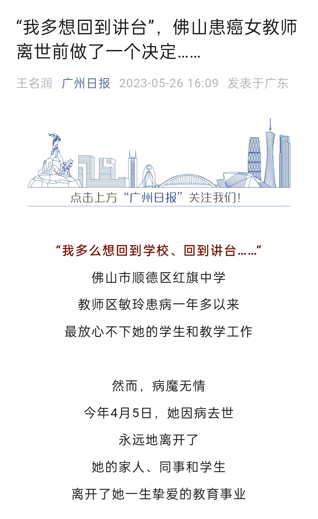 与癌症斗争!佛山一教师生前这个决定,感动无数人…